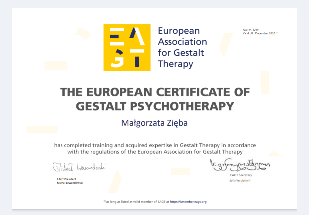 - Posiadam certyfikat EAGT European Association for Gestalt Therapy (Europejskie Stowarzyszenie Terapii Gestalt) oraz certyfikat PTPG (Polskie Towarzystwo Psychoterapii Gestalt).